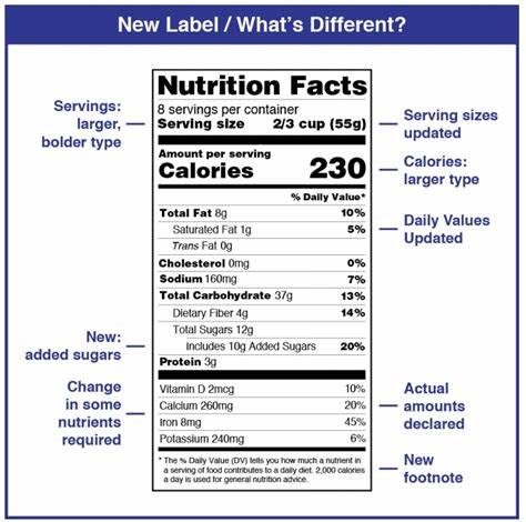 Danh sách các chất dinh dưỡng bắt buộc hoặc được phép công bố đang được cập nhật. Vitamin D và kali là bắt buộc trên nhãn. Canxi và sắt sẽ tiếp tục được yêu cầu. Vitamin A và C không còn bắt buộc nhưng có thể được bổ sung trên cơ sở tự nguyện.