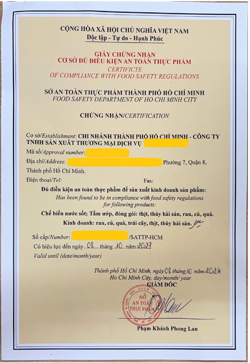 ***VỀ XÁC NHẬN TẬP HUẤN KIẾN THỨC AN TOÀN THỰC PHẨM: Do doanh nghiệp tự tổ chức thực hiện và Chủ cơ sở xác nhận và tự chịu trách nhiệm. Việc tổ chức thi và cấp giấy xác nhận kiến thức về ATTP đã chính thức được bãi bỏ.