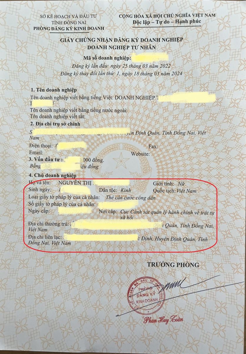 + Trả kết quả là Giấy đăng ký kinh doanh mới - cập nhật thông tin CCCD của người đại diện pháp luật.