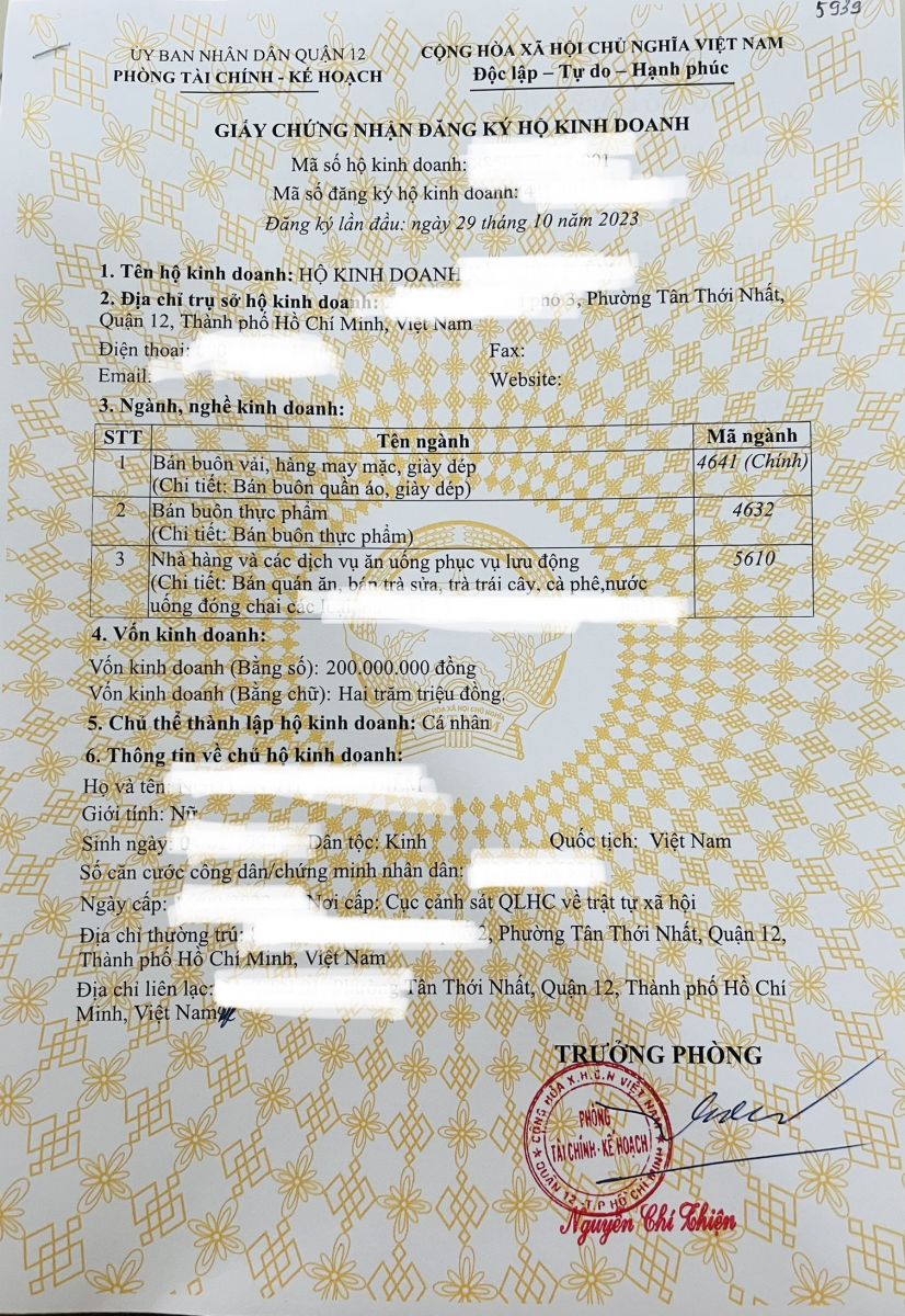 3. Nộp Hồ sơ - Cơ quan có thẩm quyền giải quyết: Cơ quan đăng ký kinh doanh cấp Huyện nơi đặt trụ sở hộ kinh doanh; - Số lượng hồ sơ: 01 bộ; - Phương thức nộp: + Chủ Hộ kinh doanh nộp Hồ sơ trực tiếp tại cơ quan Đăng ký kinh doanh cấp Huyện (Quận) hoặc nộp hồ sơ trực tuyến tại + Nộp trực tiếp tại cơ quan đăng ký kinh doanh cấp Quận/Huyện ► Nhận lại biên nhận và đợi kết quả (Kết quả được chấp thuận là Giấy Đăng ký Hộ kinh doanh hoặc yêu cầu sửa đổi, bổ sung hồ sơ (nếu có)). Thời hạn giải quyết: 03 ngày làm việc. + Nộp Trực tuyến tại Cổng dịch vụ công Quốc gia. (Quý khách hàng đăng ký tài khoản dịch vụ công Quốc gia, tra cứu mục Đăng ký hộ kinh doanh, scan lại toàn bộ hồ sơ như hướng dẫn ở mục 2, tải hồ sơ và lưu lại biên nhận (Kết quả được chấp thuận là Giấy Đăng ký Hộ kinh doanh hoặc yêu cầu sửa đổi, bổ sung hồ sơ (nếu có)). Thời hạn giải quyết: 03 ngày làm việc. ***Trong vòng 10 ngày kể từ ngày được cấp giấy chứng nhận đăng ký Hộ Kinh Doanh, Chủ hộ kinh doanh thực hiện khai thuế tại cơ quan thuế cấp Huyện nơi đặt trụ sở. (Mang theo Giấy tờ cá nhân của Chủ hộ, bản sao Giấy đăng ký Hộ Kinh doanh, Tờ Khai thuế và bổ sung Giấy tờ theo yêu cầu của cơ quan thuế). B. NHỮNG LƯU Ý KHI THÀNH LẬP HỘ KINH DOANH 1. Quyền thành lập Hộ kinh doanh và nghĩa vụ đăng ký hộ kinh doanh (Điều 80 Nghị định 01/2021/NĐ-CP về đăng ký doanh nghiệp) như sau: 1. Cá nhân, thành viên hộ gia đình là công dân Việt Nam có năng lực hành vi dân sự đầy đủ theo quy định của Bộ luật Dân sự có quyền thành lập hộ kinh doanh theo quy định tại Chương này, trừ các trường hợp sau đây: a) Người chưa thành niên, người bị hạn chế năng lực hành vi dân sự; người bị mất năng lực hành vi dân sự; người có khó khăn trong nhận thức, làm chủ hành vi; b) Người đang bị truy cứu trách nhiệm hình sự, bị tạm giam, đang chấp hành hình phạt tù, đang chấp hành biện pháp xử lý hành chính tại cơ sở cai nghiện bắt buộc, cơ sở giáo dục bắt buộc hoặc đang bị Tòa án cấm đảm nhiệm chức vụ, cấm hành nghề hoặc làm công việc nhất định; c) Các trường hợp khác theo quy định của pháp luật có liên quan. 2. Cá nhân, thành viên hộ gia đình quy định tại khoản 1 Điều này chỉ được đăng ký một hộ kinh doanh trong phạm vi toàn quốc và được quyền góp vốn, mua cổ phần, mua phần vốn góp trong doanh nghiệp với tư cách cá nhân. 3. Cá nhân, thành viên hộ gia đình đăng ký hộ kinh doanh không được đồng thời là chủ doanh nghiệp tư nhân, thành viên hợp danh của công ty hợp danh trừ trường hợp được sự nhất trí của các thành viên hợp danh còn lại. 2. Quy định về Đặt tên Hộ Kinh doanh (Điều 88 Nghị định 01/2021/NĐ-CP về đăng ký doanh nghiệp) như sau: 1. Hộ kinh doanh có tên gọi riêng. Tên hộ kinh doanh bao gồm hai thành tố theo thứ tự sau đây: a) Cụm từ “Hộ kinh doanh”; b) Tên riêng của hộ kinh doanh. Tên riêng được viết bằng các chữ cái trong bảng chữ cái tiếng Việt, các chữ F, J, Z, W, có thể kèm theo chữ số, ký hiệu. 2. Không được sử dụng từ ngữ, ký hiệu vi phạm truyền thống lịch sử, văn hóa, đạo đức và thuần phong mỹ tục của dân tộc để đặt tên riêng cho hộ kinh doanh. 3. Hộ kinh doanh không được sử dụng các cụm từ “công ty”, “doanh nghiệp” để đặt tên hộ kinh doanh. 4. Tên riêng hộ kinh doanh không được trùng với tên riêng của hộ kinh doanh đã đăng ký trong phạm vi cấp huyện. 3. Số lao động - Không hạn chế - Không còn bắt buộc số lao động dưới 10 người như quy định tại Nghị định 78/2015/NĐ-CP 4. Địa điểm kinh doanh (Điều 86 Nghị định 01/2021/NĐ-CP về đăng ký doanh nghiệp) - Mỗi Hội kinh doanh chỉ được đăng ký một địa điểm làm trụ sở kinh doanh trên giấy phép đăng ký hộ kinh doanh. - Một Hộ kinh doanh có thể hoạt động kinh doanh tại nhiều địa điểm và phải thông báo cho Cơ quan quản lý thuế, cơ quan quản lý thị trường nơi tiến hành hoạt động kinh doanh đối với các địa điểm còn lại. 5. Ngành nghề đăng ký kinh doanh (Kể từ ngày 01/07/2023 lựa chọn ngành nghề kinh tế cấp 4 theo Hệ thống ngành nghề kinh tế Việt Nam). - Tham khảo ngành nghề kinh doanh tại đây - Đối với những ngành nghề kinh doanh có điều kiện cần có đủ điều kiện về Giấy chứng nhận đủ điều kiện/Cơ sở vật chất,...tùy thuộc vào từng ngành nghề và phải đảm bảo các điều kiện đó trong suốt quá trình hoạt động thì mới tiến hành đăng ký Hộ kinh doanh và bắt đầu hoạt động kinh doanh. - Một số ngành, nghề mà hộ kinh doanh không được kinh doanh, bắt buộc phải thành lập doanh nghiệp như (Tổ chức tín dụng, dịch vụ kế toán, quản lý quỹ đầu tư chứng khoán,...) III. DỊCH VỤ THÀNH LẬP HỘ KINH DOANH TẠI VƯƠNG LUẬT 1. Báo giá - Quý Khách hàng vui lòng xem báo giá tại đây - Quý Khách hàng có nhu cầu thành lập Hộ Kinh doanh vui lòng điền thông tin vào mẫu
