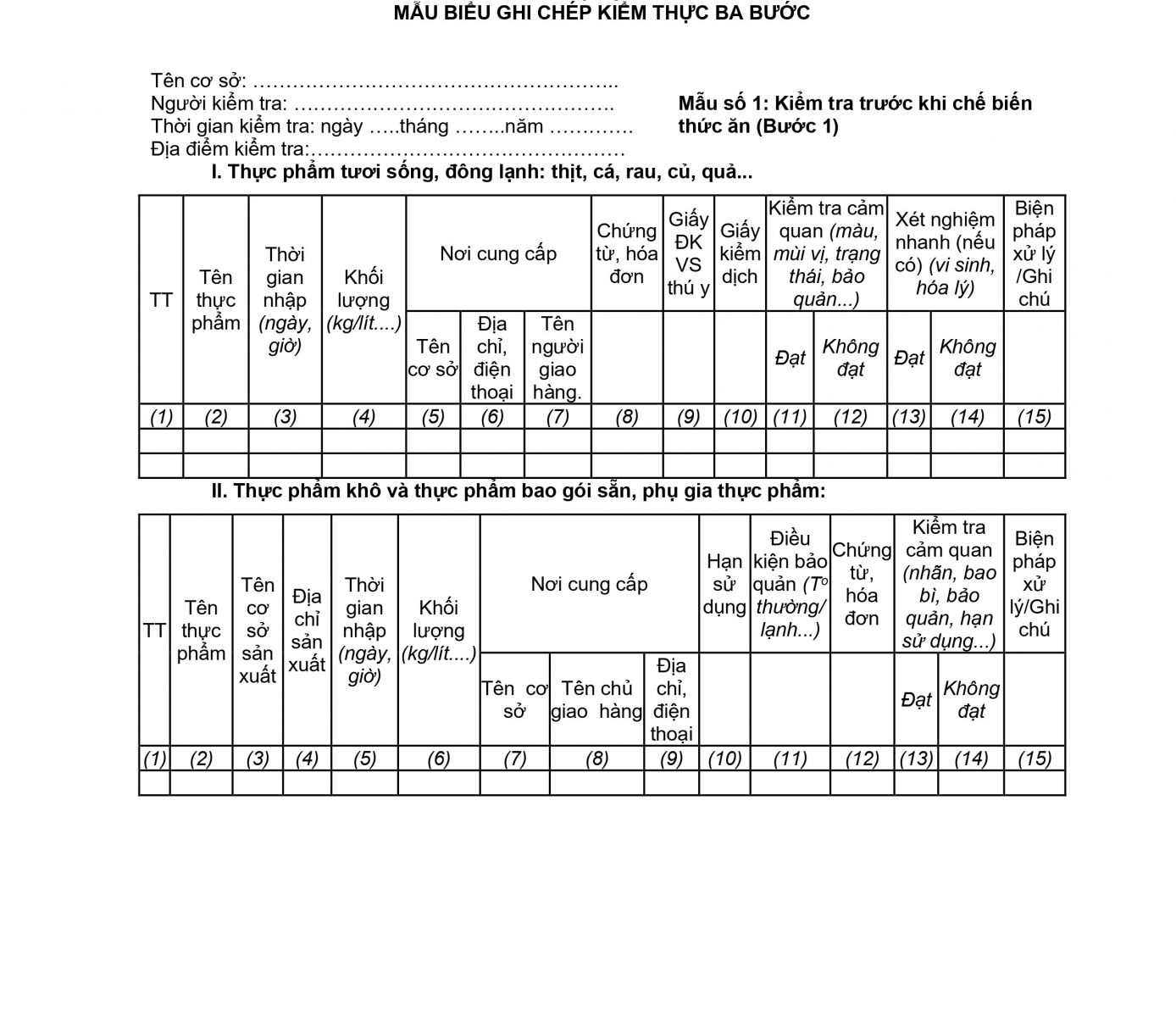 3. Thông tin kiểm tra trước khi chế biến (Bước 1) được ghi chép vào Mẫu số 1, Phụ lục 1: Mẫu biểu ghi chép kiểm thực ba bước.