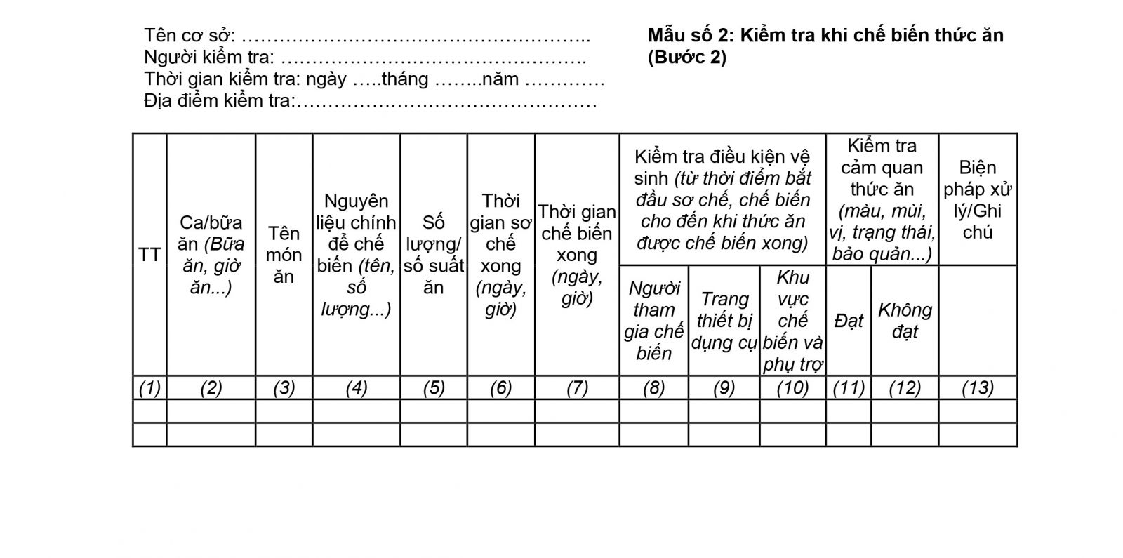 4. Các thông tin kiểm tra trong quá trình chế biến thức ăn (Bước 2) được ghi vào Mẫu số 2, Phụ lục 1: Mẫu biểu ghi chép kiểm thực ba bước.