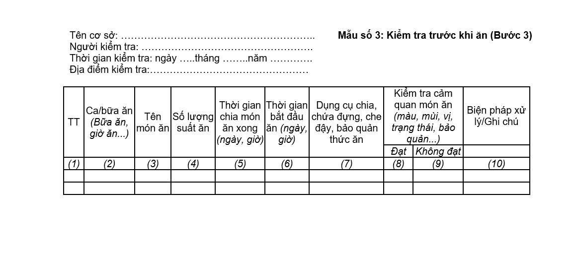 6. Các thông tin kiểm tra trước khi ăn (Bước 3) được ghi vào Mẫu số 3, Phụ lục 1: Mẫu biểu ghi chép kiểm thực ba bước.