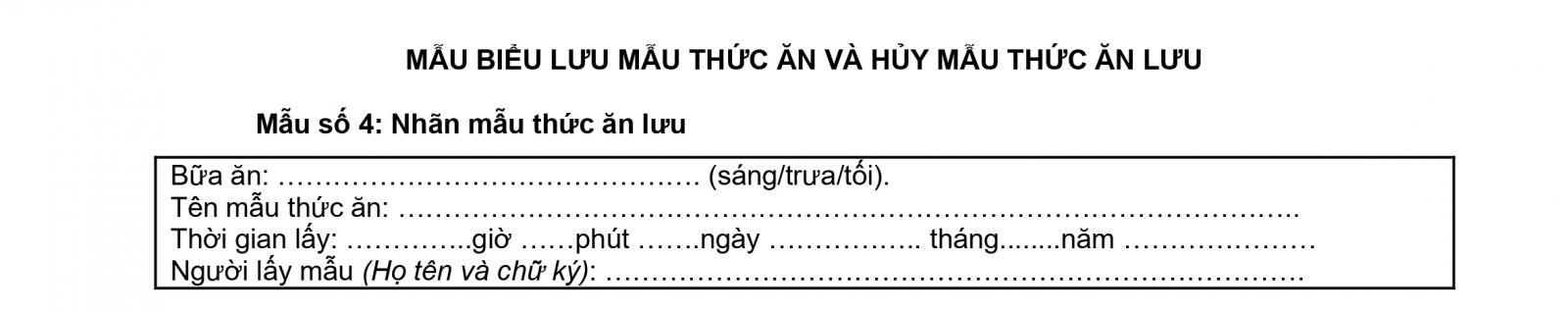Các thông tin về mẫu thức ăn lưu được ghi trên nhãn (theo Mẫu số 4 Phụ lục 2: Mẫu biểu lưu mẫu thức ăn và hủy mẫu thức ăn lưu) và cố định vào dụng cụ lưu mẫu thức ăn.
