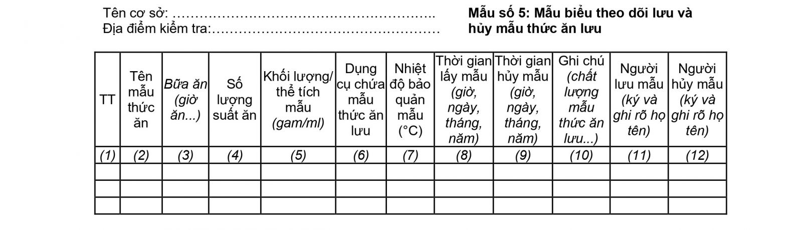 - Thực hiện ghi chép đầy đủ vào Mẫu biểu theo dõi lưu và hủy mẫu thức ăn theo mẫu số 5 Phụ lục 2: